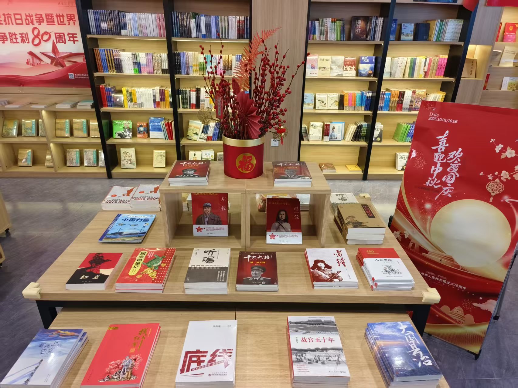 10月1日-10月8日,卢龙新华书店开展国庆主题图书展活动,活动精心挑选了一系列与国庆主题紧密相关的优质图书,涵盖红色经典、爱国主义教育读物、国庆历史回顾、国家建设成就展示等方面图书进行集中展销,在门店设立国庆主题图书展台,带领读者回顾历史,了解祖国发展脉络,激发爱国热情。