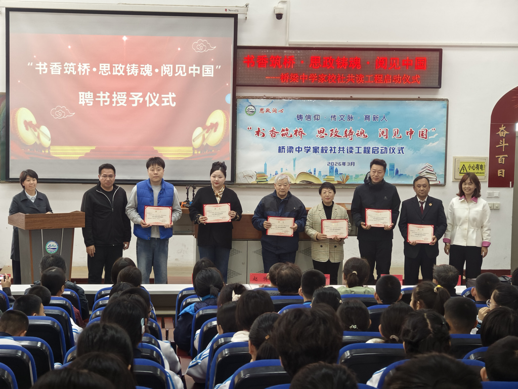 为深入推进本区书香校园建设,厚植学生家国情怀,3月25日,“书香筑桥·思政铸魂·阅见中国”桥梁中学家校社共读工程启动仪式在山海关区桥梁中学礼堂隆重举行。学校师生、家长代表、山海关区教体局、区文联、区作协、区人民检察院、山海关中国长城博物馆、区新华书店、路南街道工人街社区等单位参与本次活动,共赴书香之约,共启阅读新程。